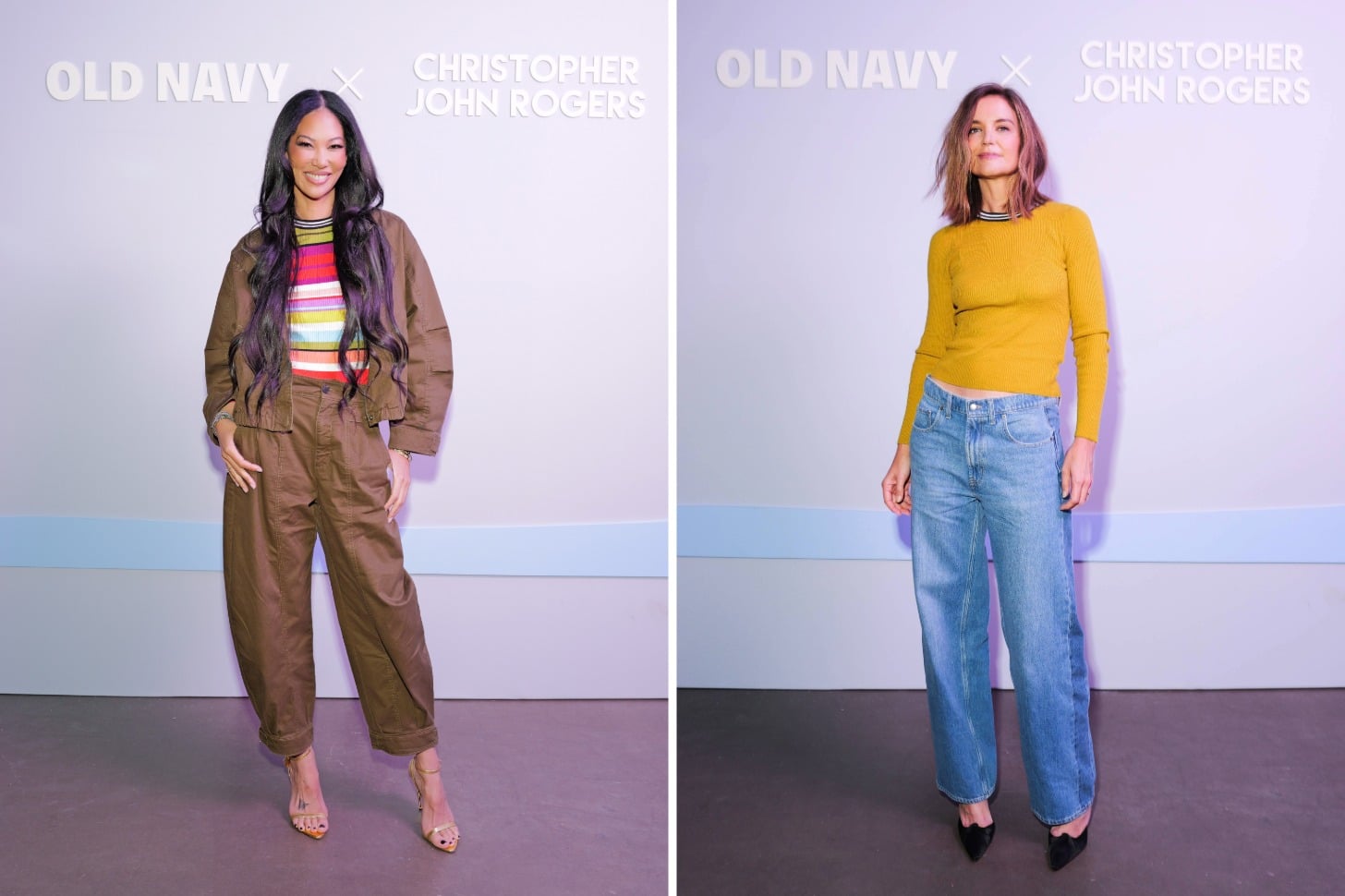 Look no further than the launch event for inspiration. Street-style darling Chloe King is already separating the polka dot three-piece set, choosing instead to pair the scarf and skirt with a ruffle plaid crop top. Campaign star and style icon Kimora Lee Simmons takes a subtler approach, styling the striped top with olive barrel pants and a bomber jacket for a pop of color. Katie Holmes opts for structured, wide-leg jeans styled with the golden olive fitted sweater. The magic of Christopher John Rogers is sharing in his joy and reverence for fashion in a way that feels unique and authentic to you. And Rogers encourages it. "I think that's what's so fun about this collection is that there's so many opportunities to discover yourself and to try new things without feeling scared," he explains. "Being able to put the polka dot skirt with a striped sweater or something more directional back to jeans."
