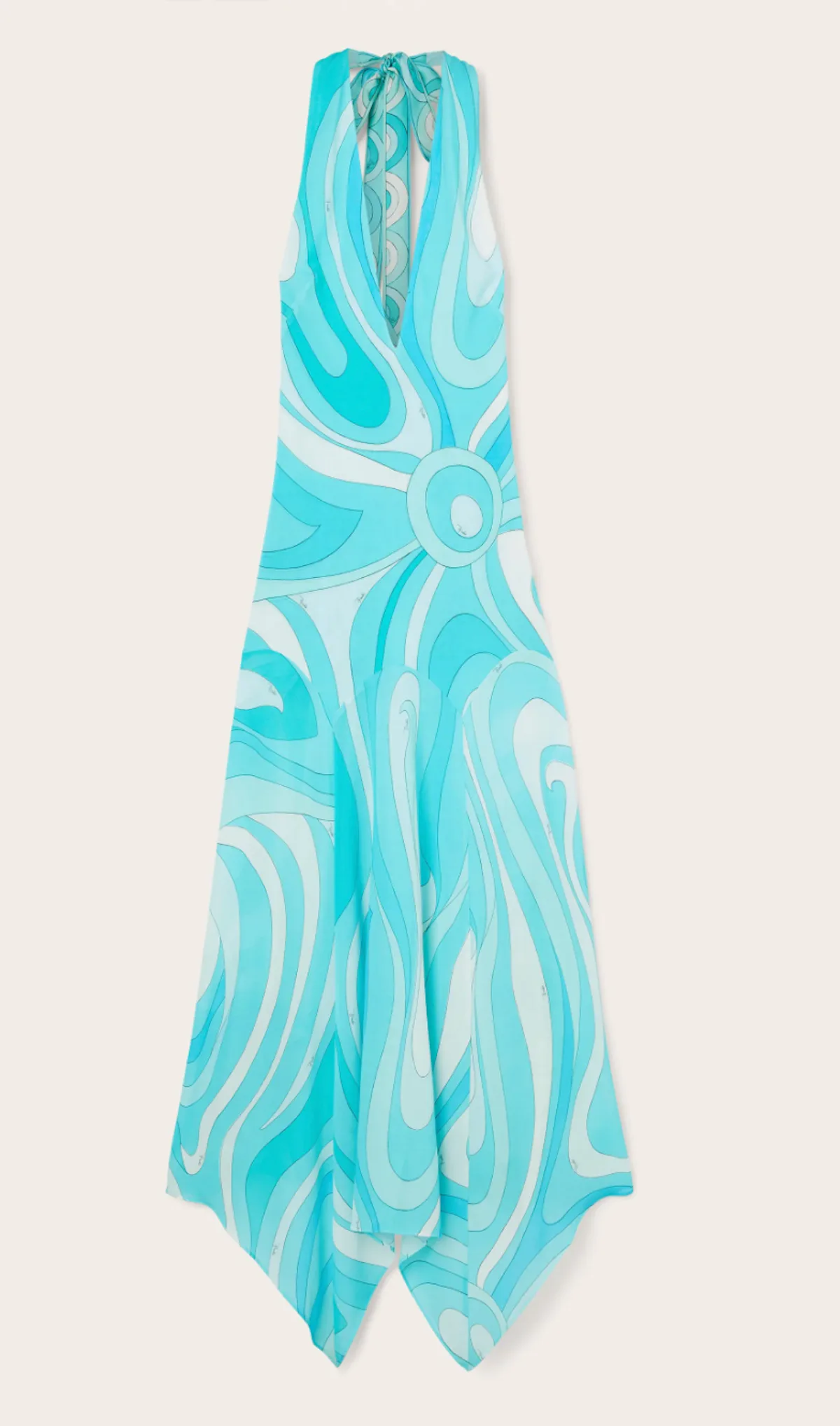 Spring and summer dressing feels incomplete without Emilio Pucci, a house known for its vivid color and vibrant energy. This aquamarine-and-white palette feels light and graphic, moving easily from coastal mornings in Mykonos (my dream) or your local beach town. It’s statement-making and will definitely draw in compliments.