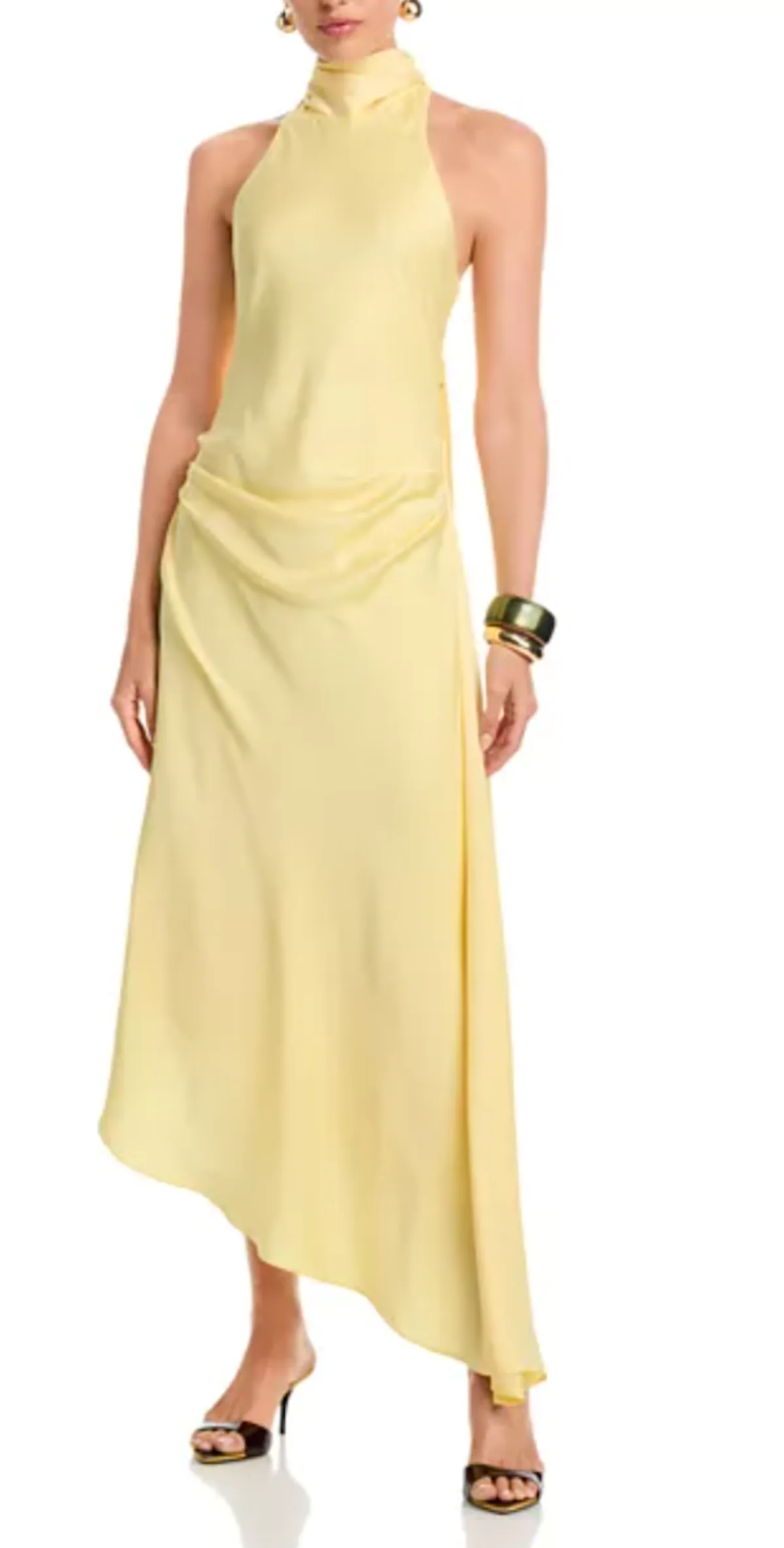 Do you have plans of attending a spring or summer wedding and not sure what to wear? No worries, this halter style featuring a lovely butter-yellow shade pairs perfectly with the warmth of the season and gives you that effortless, Kate Hudson-inspired moment.