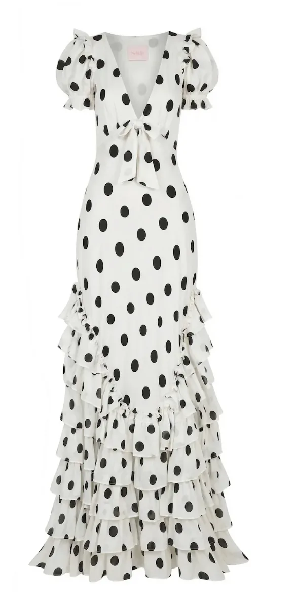 Polka dots, bows, and ruffles — what could be more feminine than that? This beautiful dress is ideal for any gala, an elevated garden party, or even a graduation ceremony. Pair it with white pumps for added height, and you’ll look radiant.