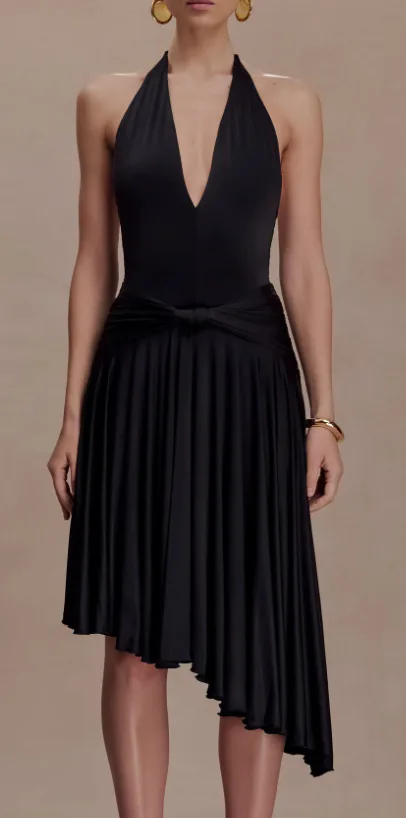 A little black dress, reimagined. This asymmetrical silhouette balances ease and intention, with a halter neckline and open back that feel quietly sensual, making it an ideal choice for those longer summer evenings.
